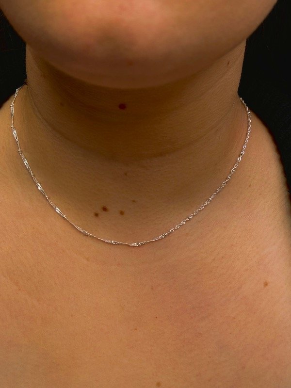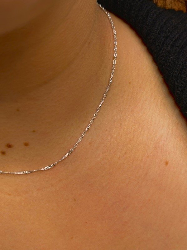 Esta cadena tiene ese equilibrio perfecto: es súper delicada pero la trama torzada le da un brillo y un movimiento que no tienen las cadenas comunes. Las mini bolitas son el detalle final para que no sea "una más" en tu joyero. Es ese caballito de batalla que te ponés a la mañana y te sirve para todo el día.