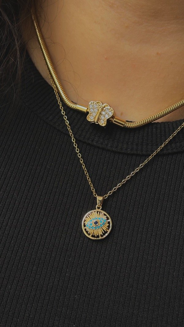 Este collar es mucho más que un accesorio lindo: es tu nuevo cable a tierra. Combina la cadena espejito, que tiene ese brillo continuo espectacular, con un dije de ojo turco cargado de micropavé.