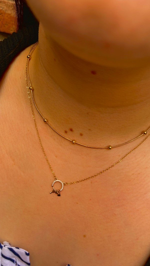 Este collar es de esos que te quedás mirando por los detalles. Es súper minimal, pero el dije con micropavé y los tres dijes colgantes (candado, corazón y llave) le dan una onda increíble. Tiene ese movimiento justo que llama la atención sin ser pesado.
