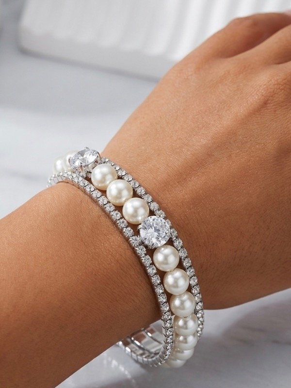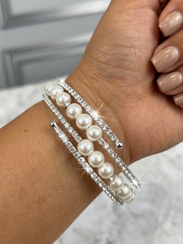 Es una pulsera elástica de acero plateado, con strass y perlas, que se adapta sola a tu muñeca sin apretar.